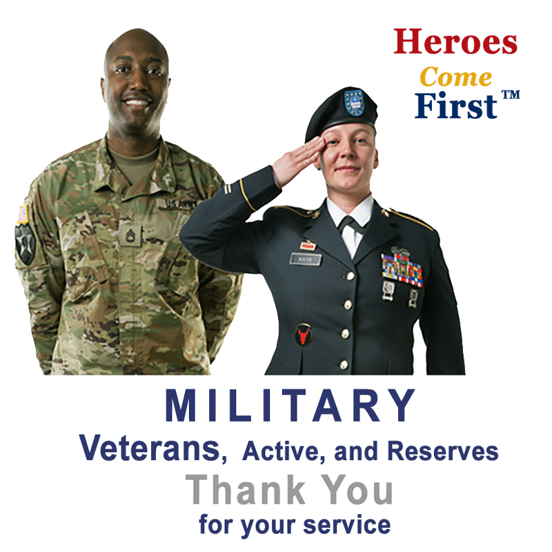 Heroes Come First benefits all current and former Military (Veterans, Active, Reserves), as well as Law Enforcement, Healthcare workers, EMS, Firefighters and Education professionals with an average reward of over $2500 when they purchase or refinance a home. In addition, $0 down VA and USDA mortgages are available. Further discounts come from our title company, home inspector and national moving company. Free Pre Approvals and credit issue management. Finally, free Interest Rate watch..when it makes financial sense for you to refinance we alert you to the savings potential.